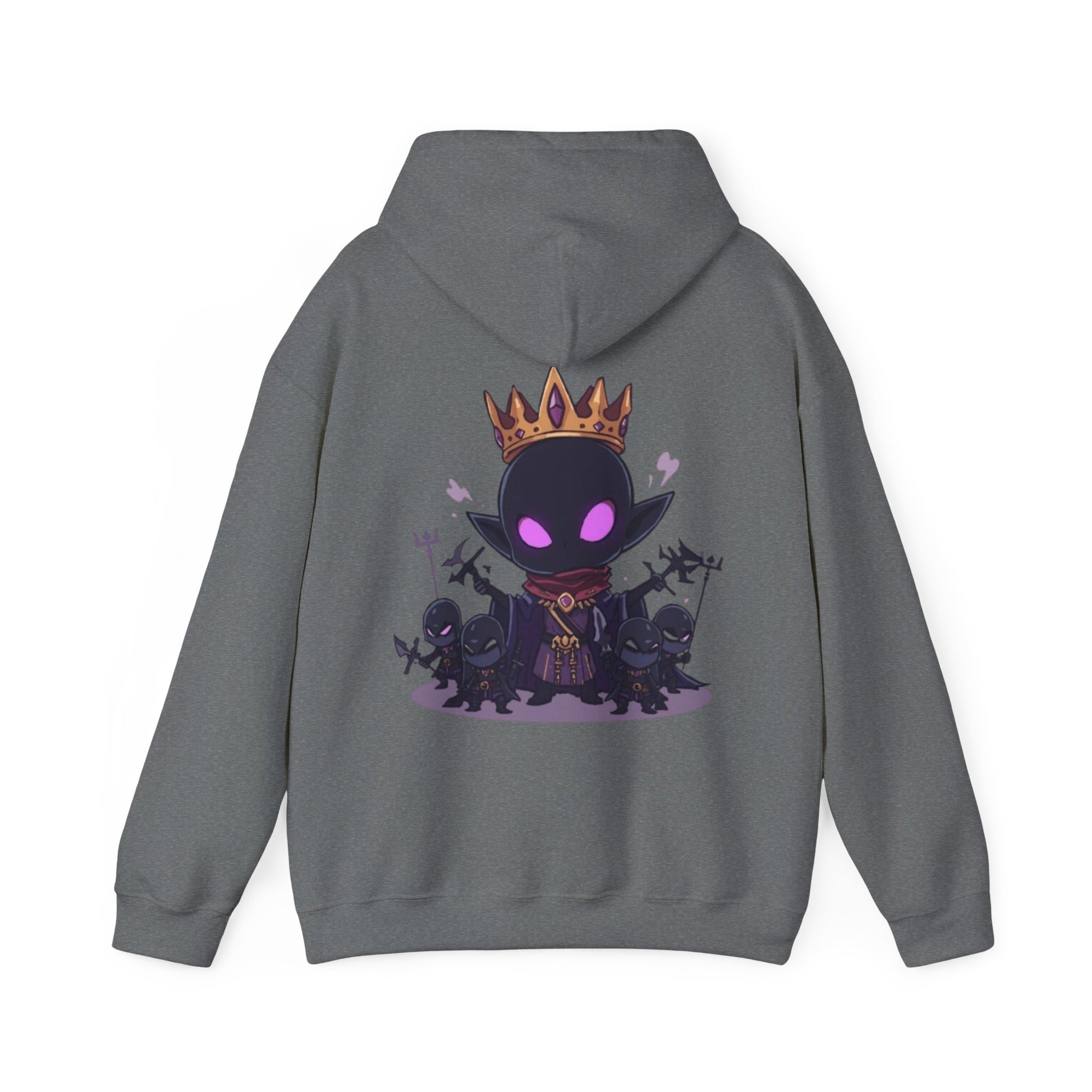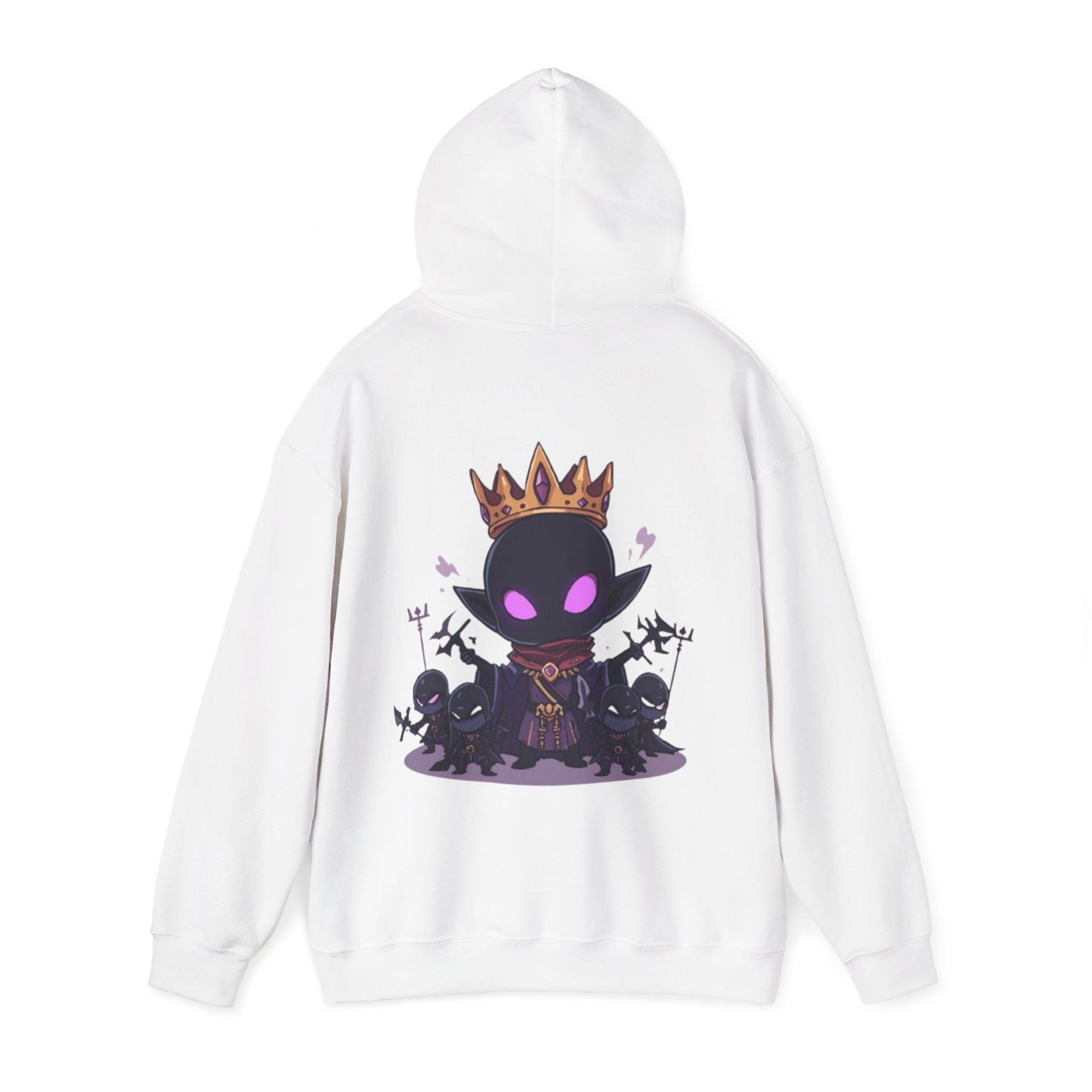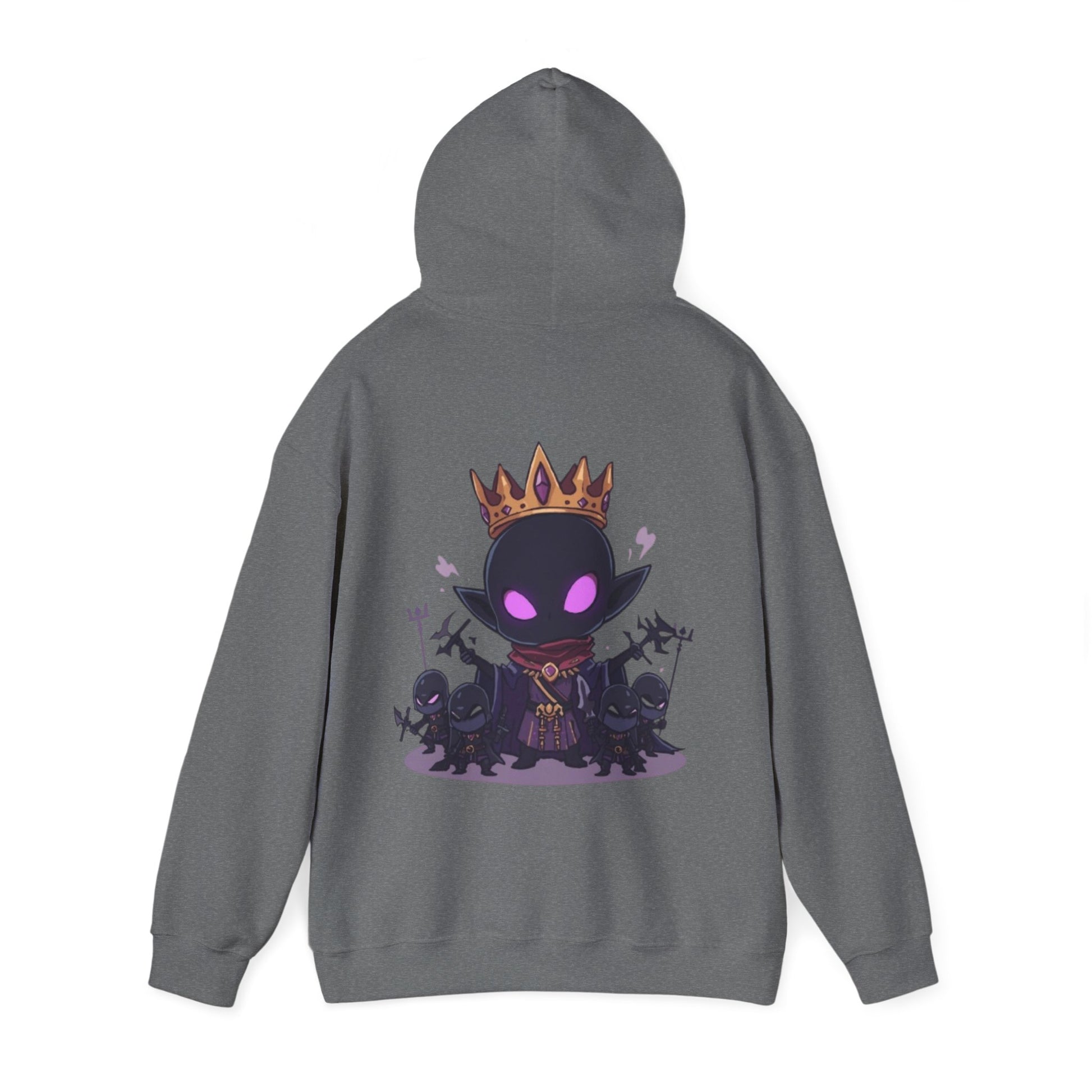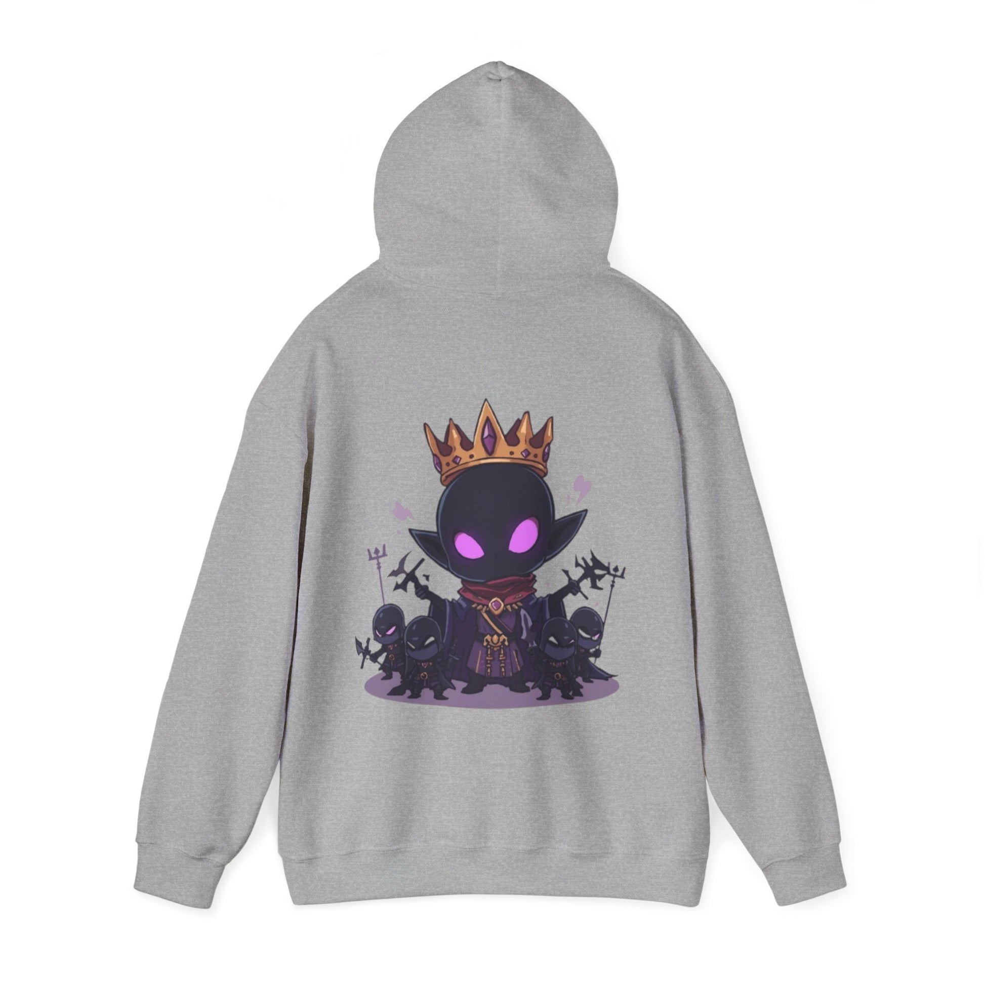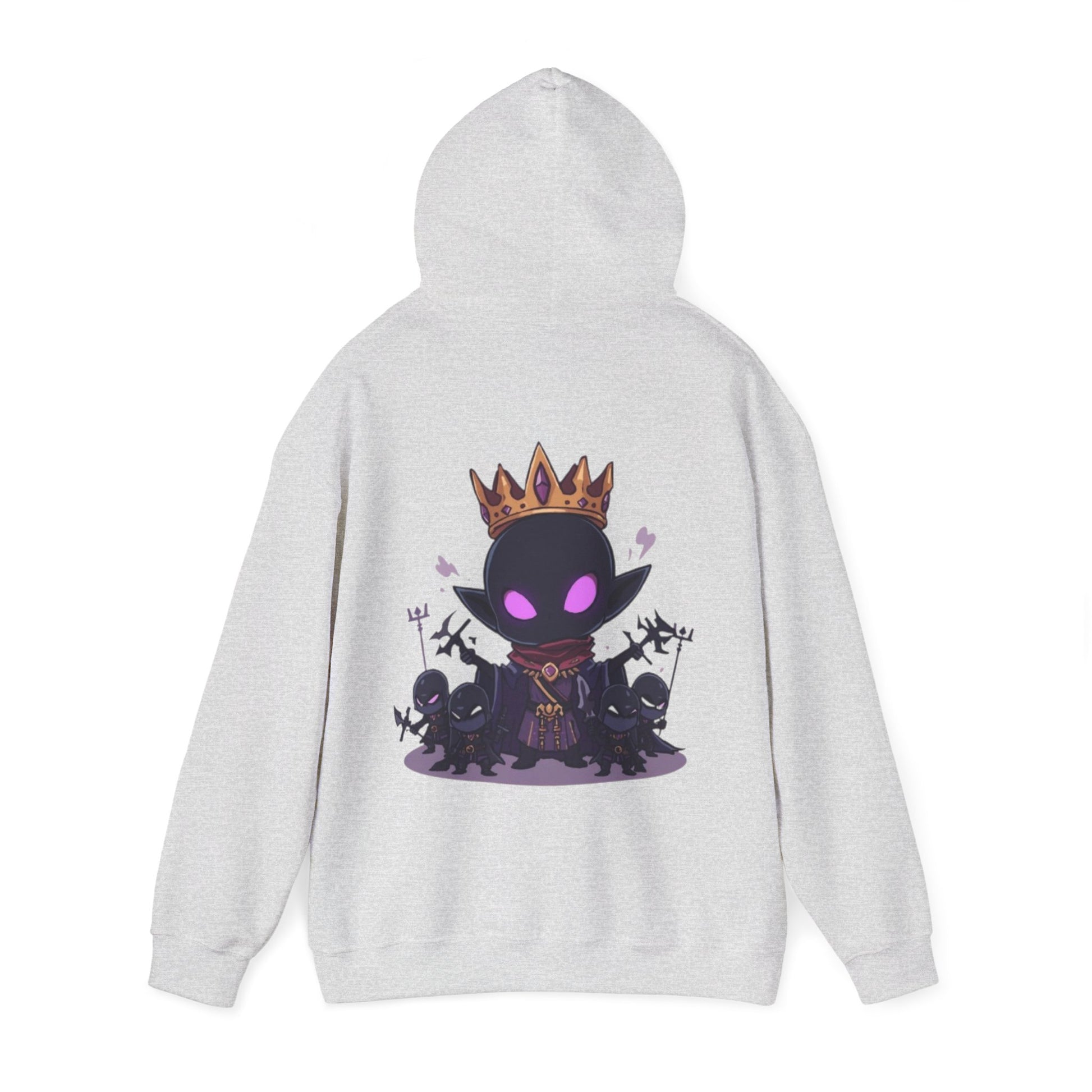 This cozy hoodie carries a playful shadow-king illustration across the back — a small dark sovereign with glowing purple eyes, a crooked golden crown, and loyal tiny minions gathered at his feet. It feels like stepping into a mischievous storybook: warm fabric, roomy hood, and a soft pouch for cold hands. Wear it on crisp evenings while gaming, sketching, or wandering city streets; the art sparks conversation and adds a sly, whimsical edge to everyday layers.